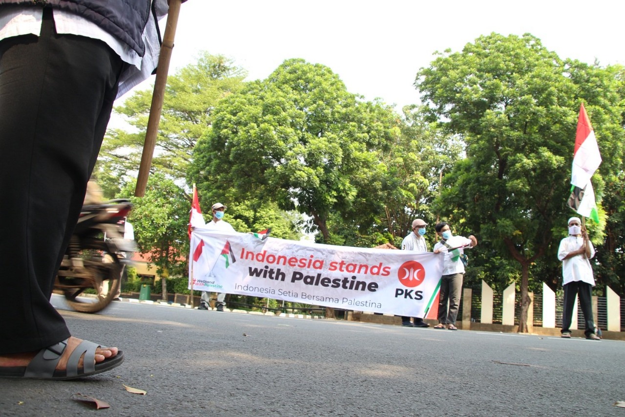 Ratusan anggota Partai Keadilan Sejahtera (PKS) Jakarta Selatan yang tersebar di sepuluh DPC menggelar aksi mendukung kemerdekaan Palestina di lokasi wilayah kecamatan masing – masing, Kamis (20/5).